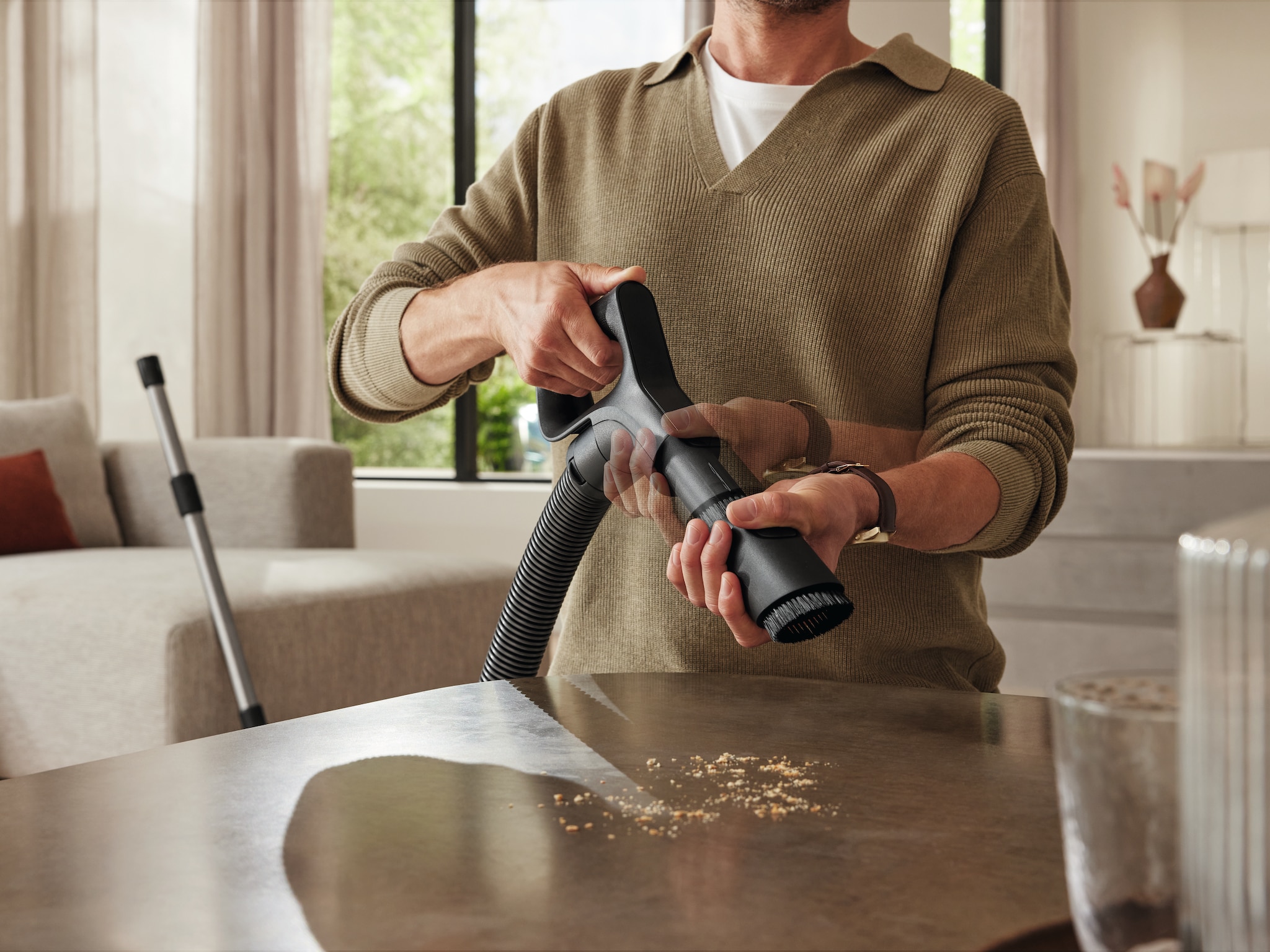 Jeśli się spieszysz: zintegrowana ssawka pędzlowa na uchwycie pozwala na szybkie czyszczenie w międzyczasie.